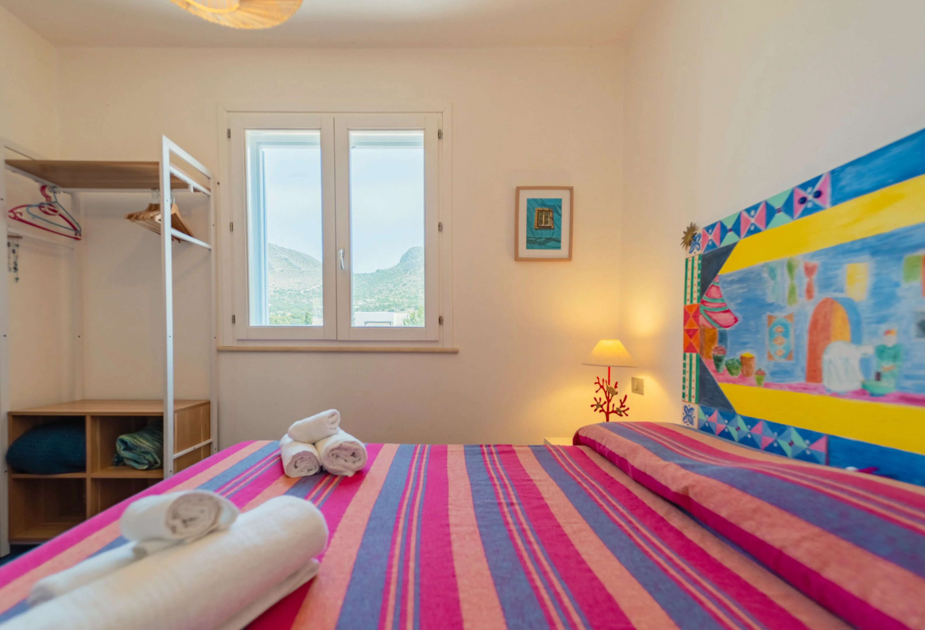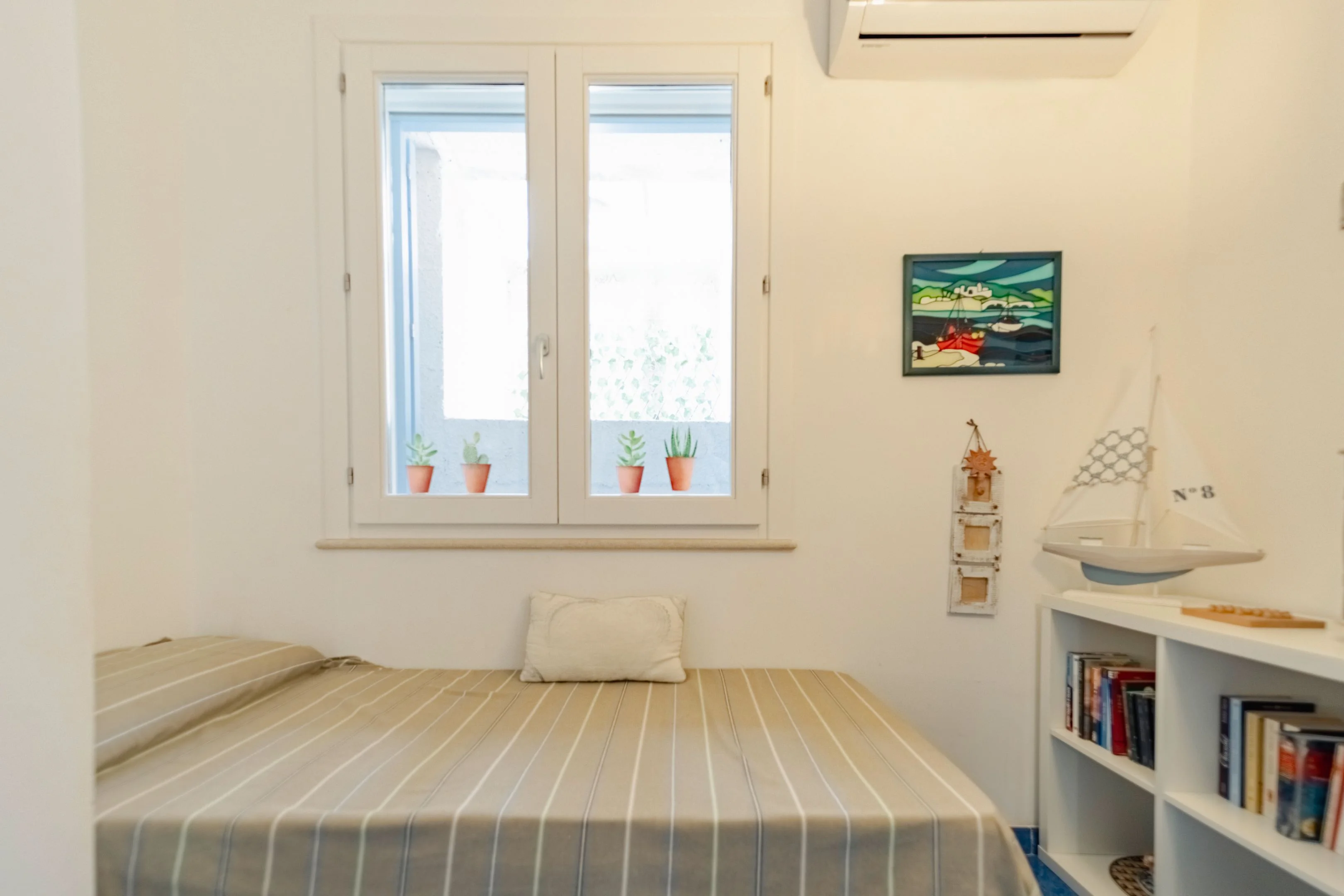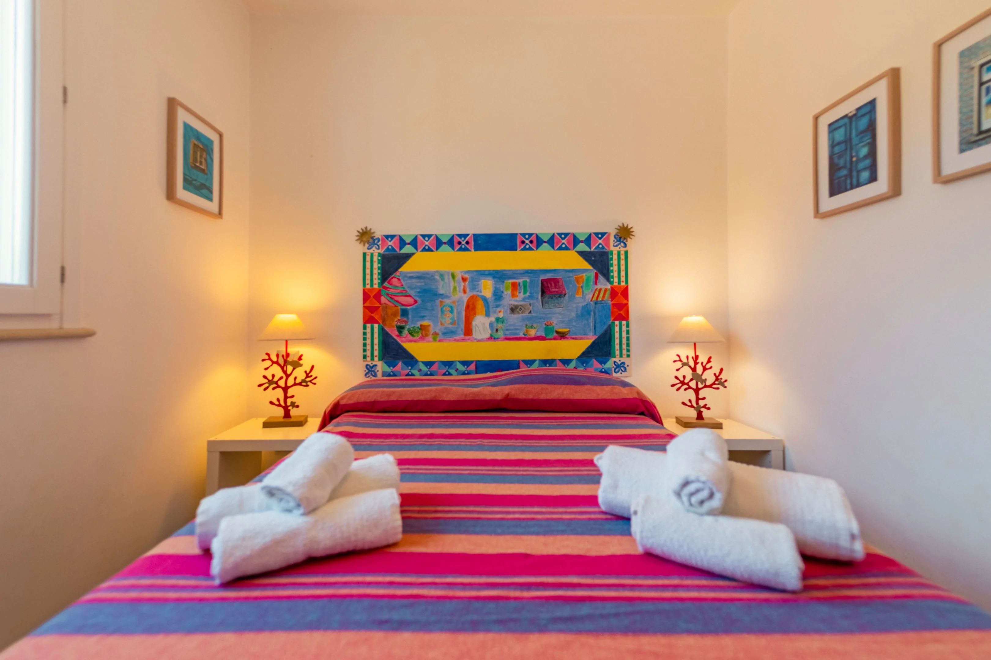 Letto matrimoniale, aria condizionata. Luminosa e colorata.
